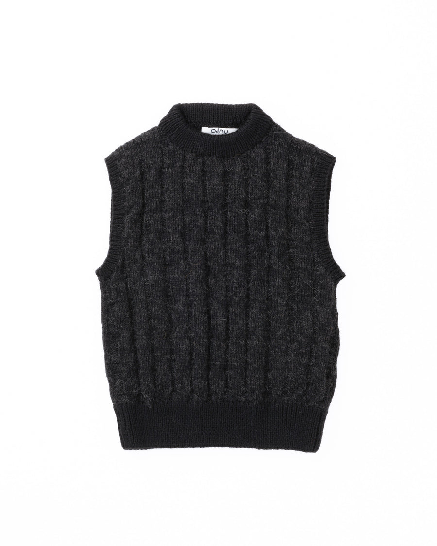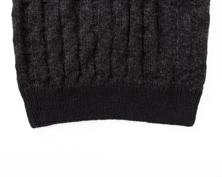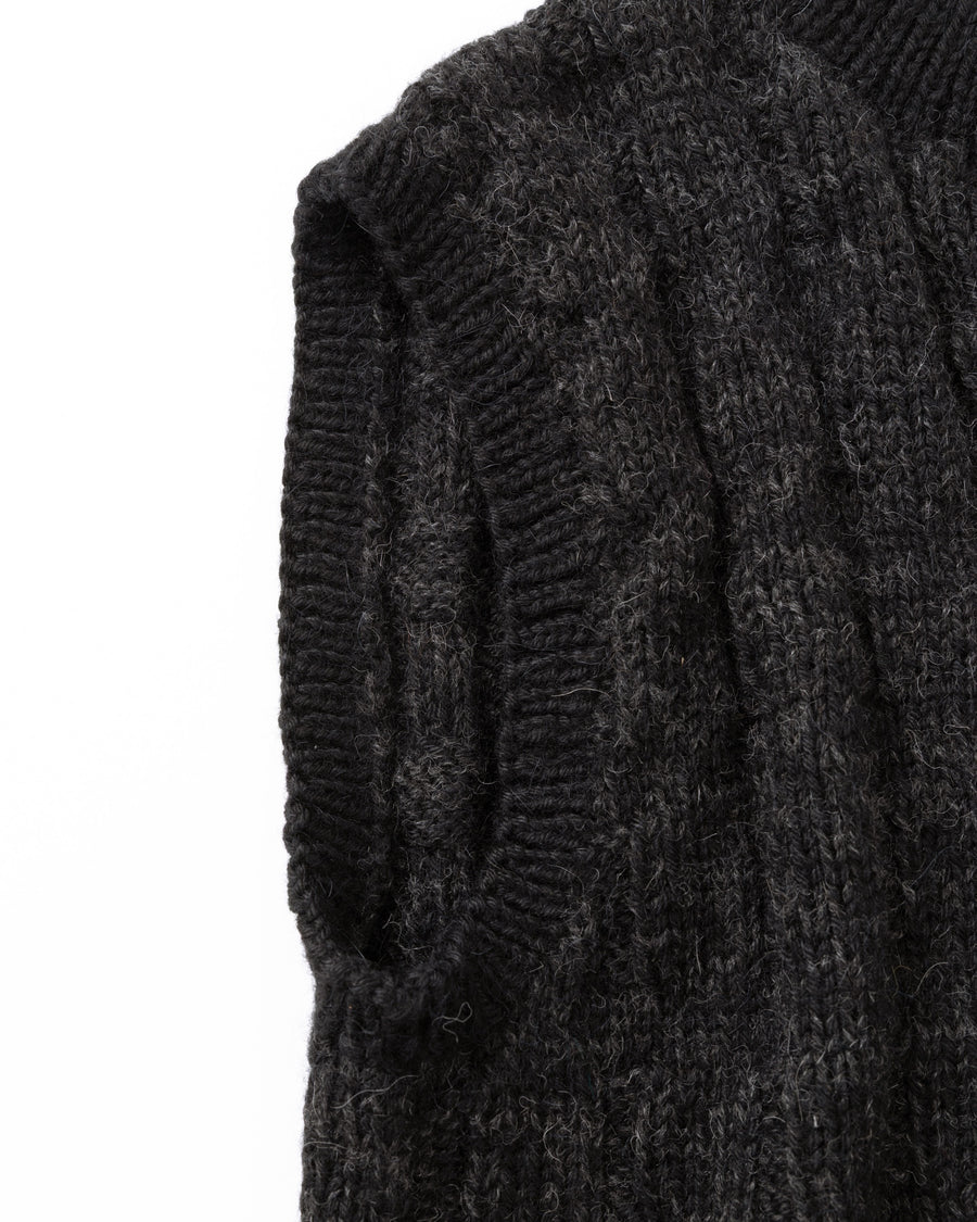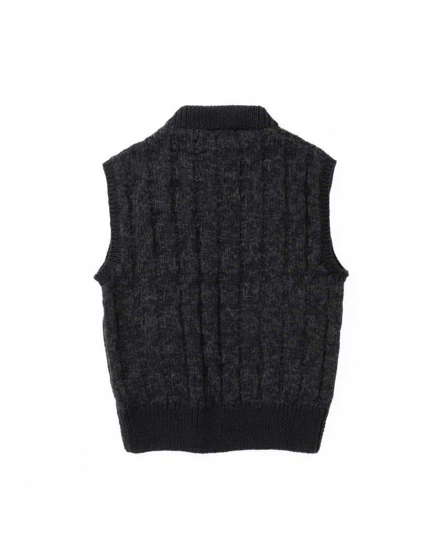 手編みならではの弾力と凹凸感のある編み模様が、古着のような懐かしさと愛着を感じさせる一枚。優しい手仕事で一目一目丁寧に編まれたこのベストは、不思議と体に馴染み、暖かく包み込んでくれます。