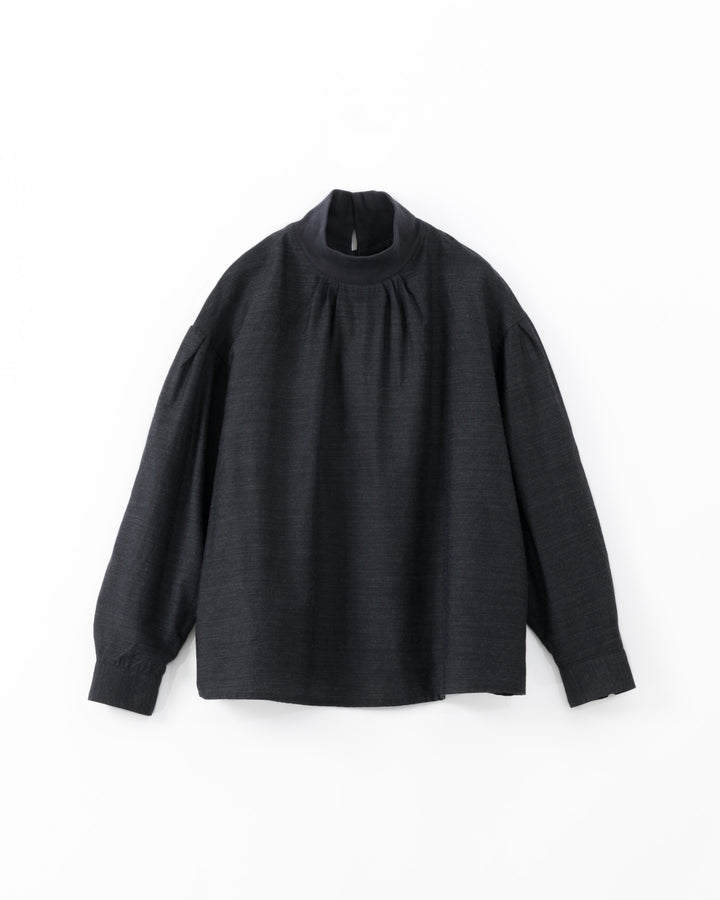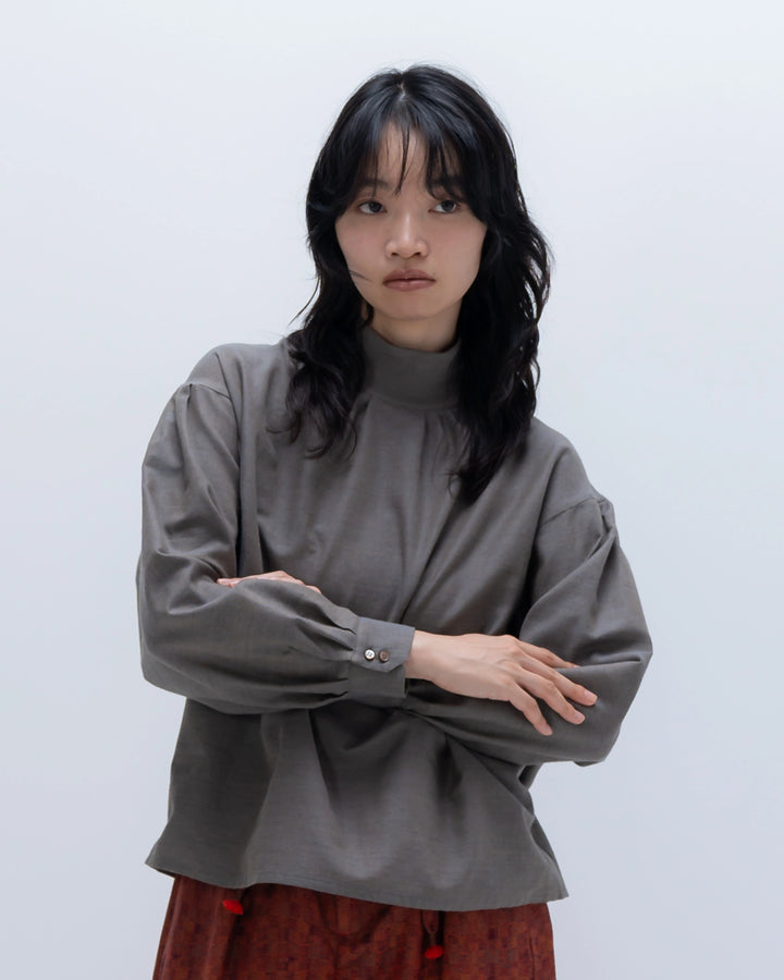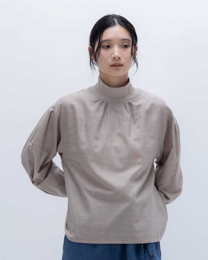 わずかに起毛した生地は、柔らかく暖かで心地よい着用感です。首に沿って立ち上がるリブが、首のラインをすっきりと美しく見せてくれます。襟元にはたっぷりとタックを寄せ、シンプルなデザインの中にさりげない華やかさを添えました。ゆったりとしたシルエットとドロップショルダーでリラックス感がありながら、袖口のカフスが全体を引き締め、上品な印象に。ボトムスを選ばず、レイヤードスタイルにも合わせやすい一枚です。