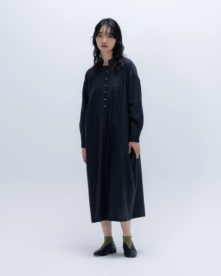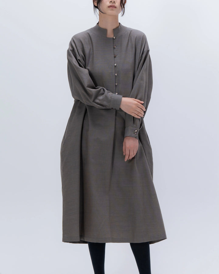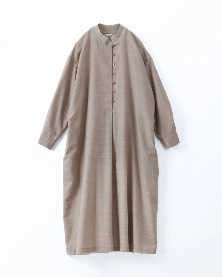 首に沿って立ち上がるリブが、首のラインをすっきりときれいに見せてくれます。程よくゆとりのあるシルエットで、首元のリブが全体のバランスを引き締めるので、リラックスした着心地でも上品な印象に。1枚でスタイリングが決まる、上質なワンピースです。